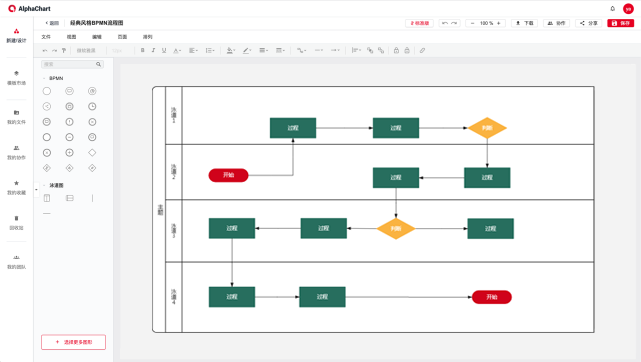 在AlphaChart中每個符號都是矢量的,可以填充顏色,改變大小,定義數據和連接。在流程圖標準符號包括4個基本流程符號橢圓形、矩形、箭頭、菱形和5類中高級的流程圖符號。